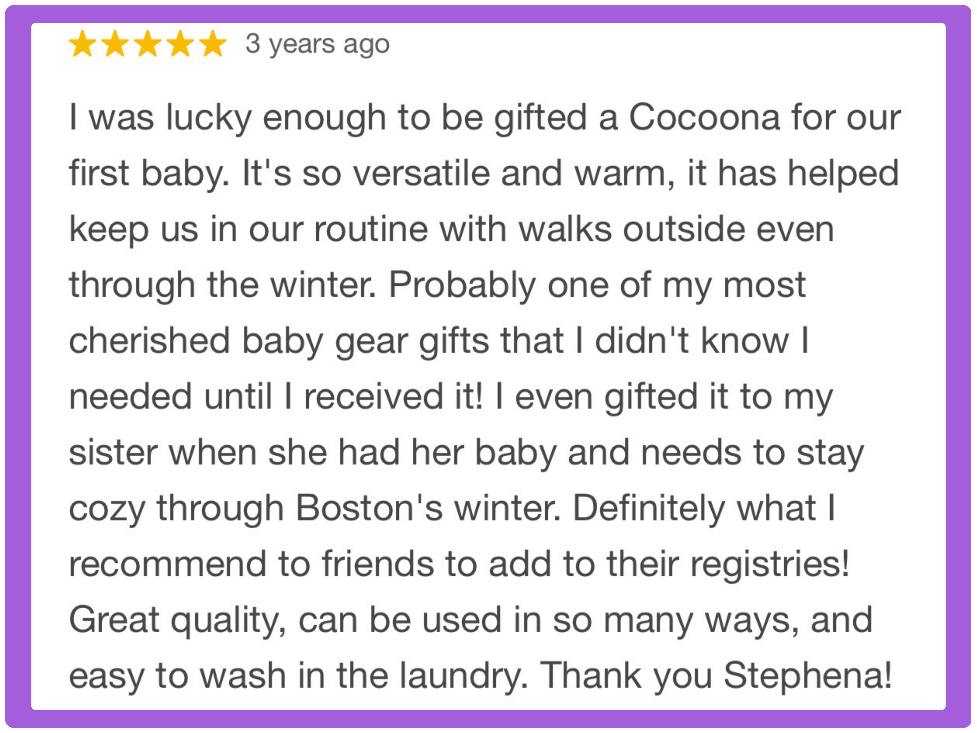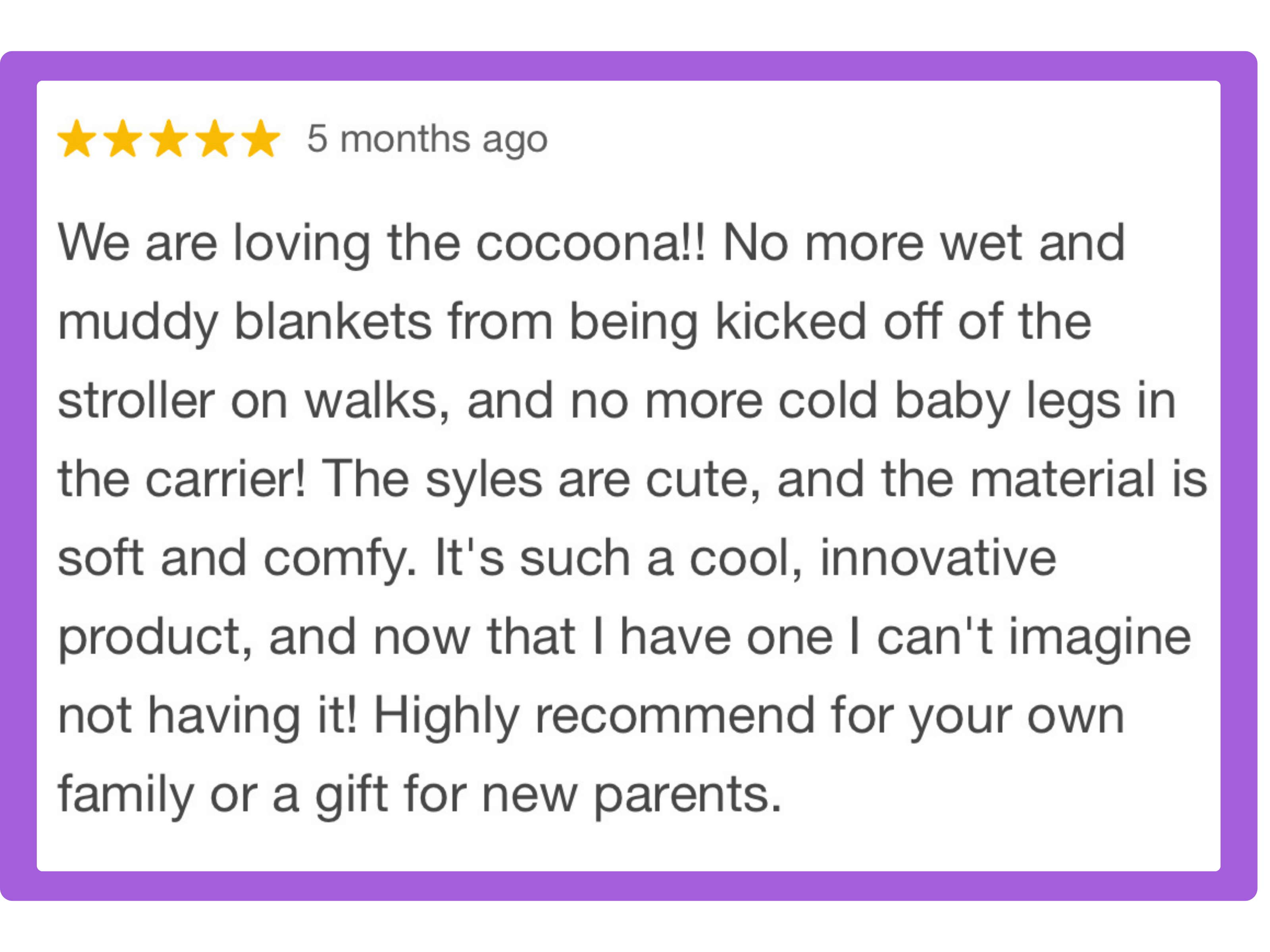 The Cocoona is better than a blanket! No more fighting with the wind, picking up a dirty blanket run over by the stroller, or buying multiple products to use on different brands or devices. The Cocoona easily goes from car seat, carrier, stroller, your arms, and beyond from birth thru toddlerhood.